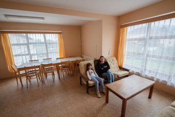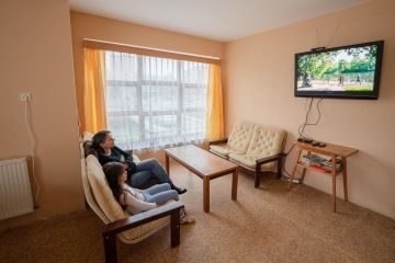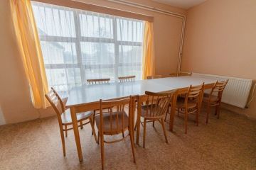 Společenská místnost je prostorná, samostatná, uzamykatelná místnost, vybavená stoly, židlemi, gaučem a televizí.